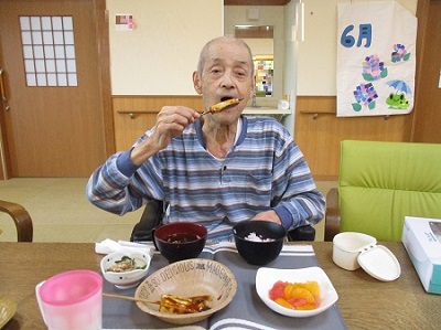 普段は細かく刻んで食べられるご入居者様も串からペロリ…!(看護師、職員しっかり見守りの下食べて頂いています!)