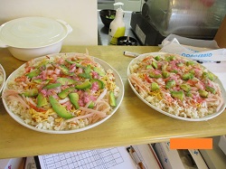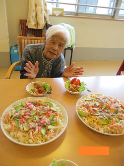 今回2Fでは、食事レクリエーションを行い 利用者様とスタッフが協力して「花ちらし」と「唐揚げ」を
