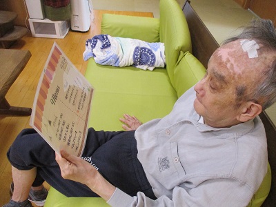 少しでも楽しんでいただけるように今月は喫茶店レクを開催しました。本格的なメニュー表も作って皆様に選んで頂きました。