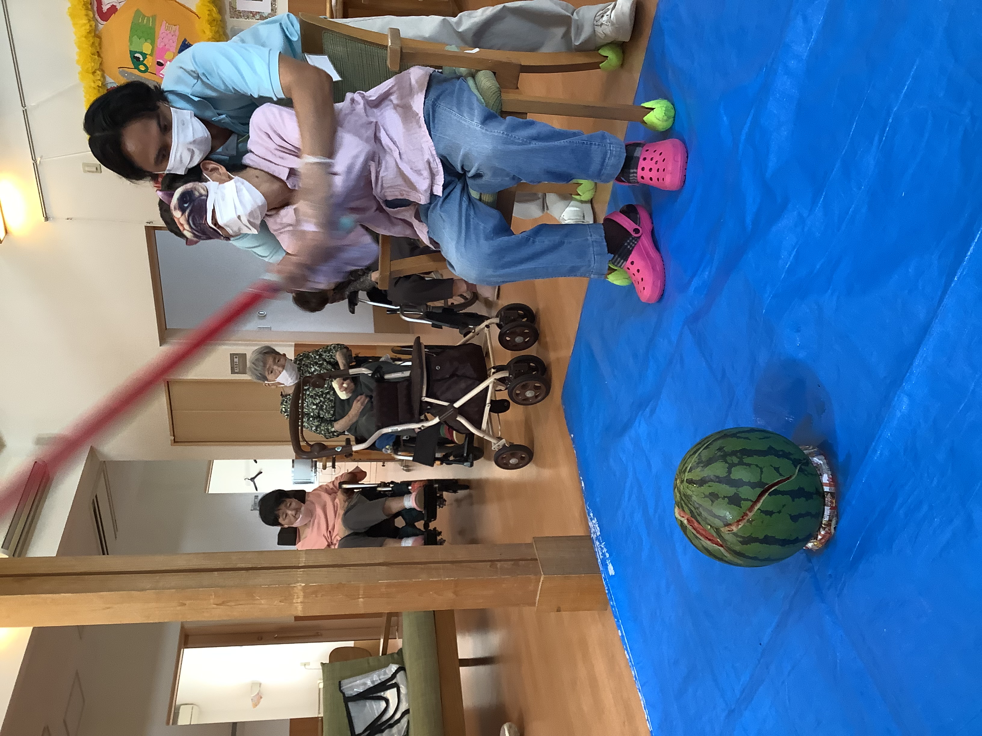 フロア全体をつかい、隣の団欒さんと合同で行いました。棒を上手につかい、スイカを割りました♪