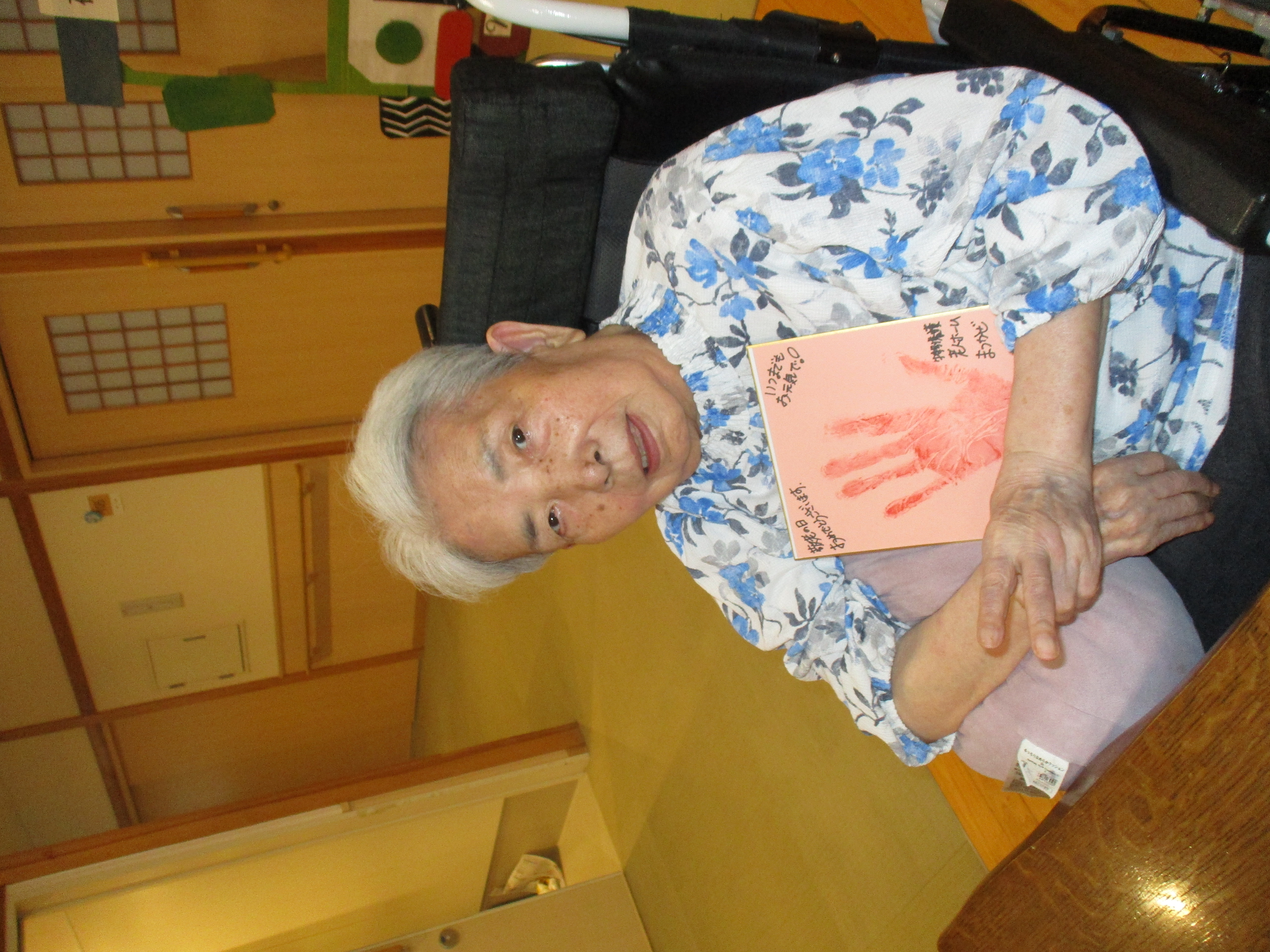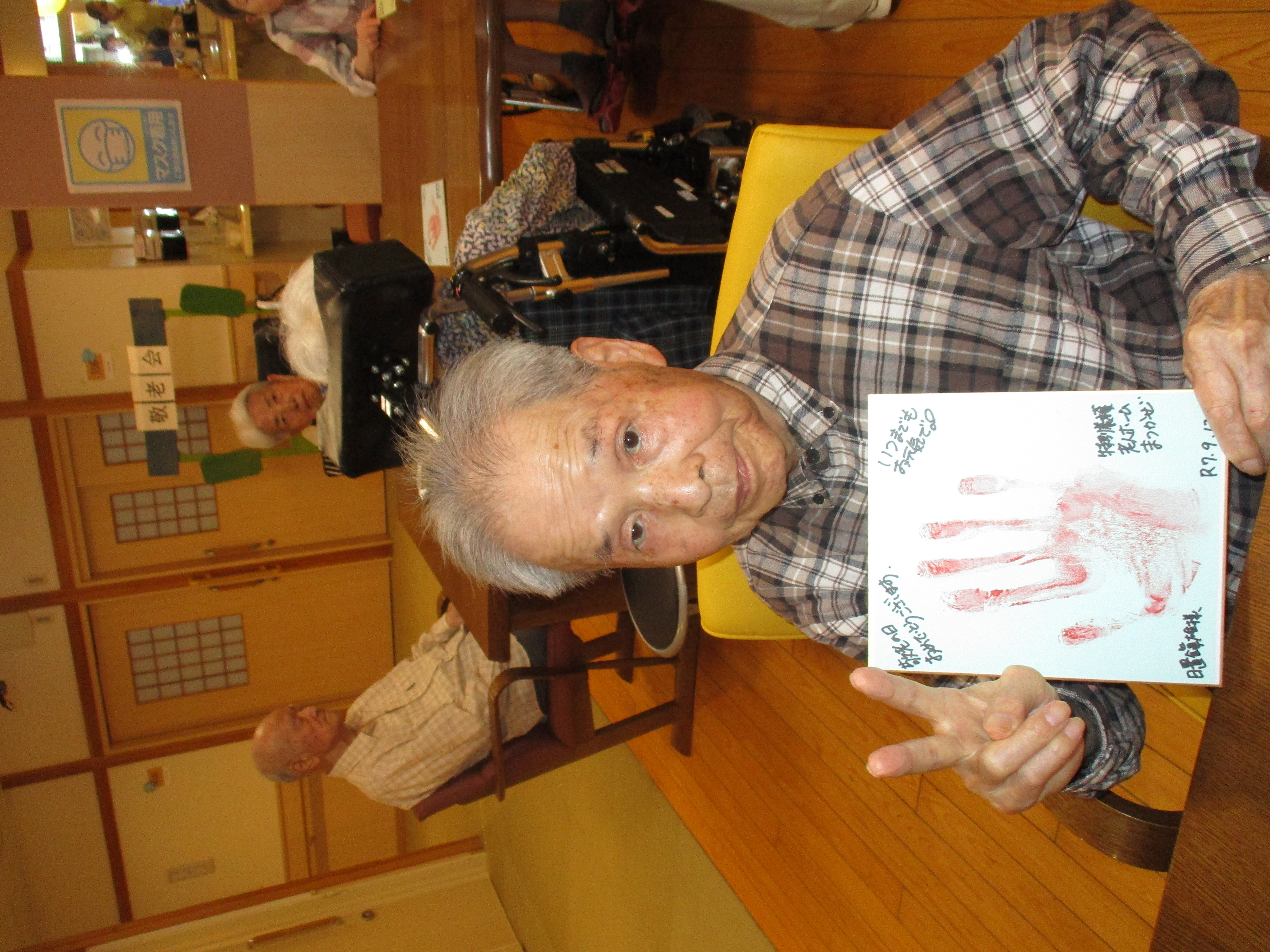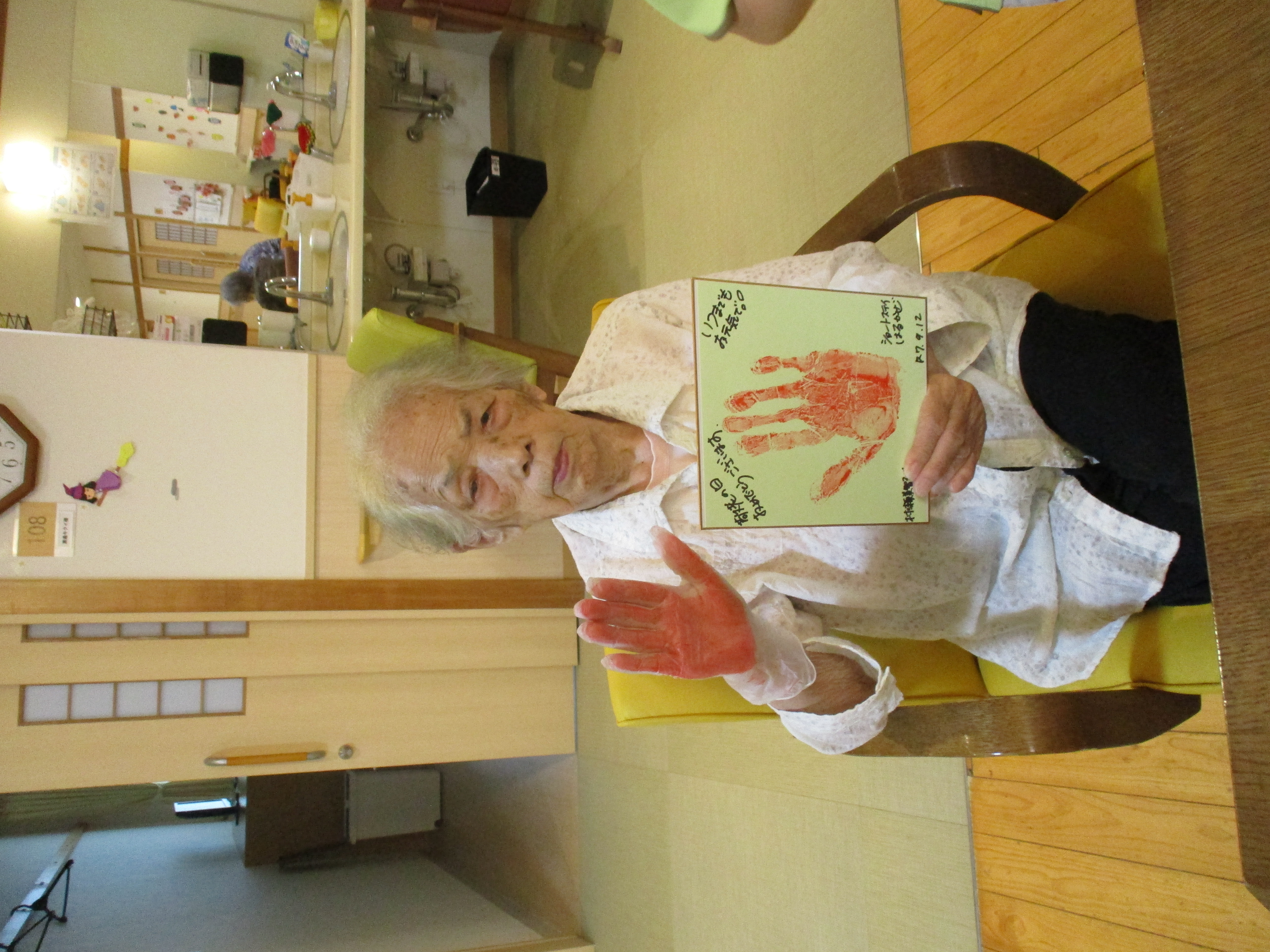 今年の敬老会では、皆様の手形を色紙に押して記念のプレゼントをお作りしました。