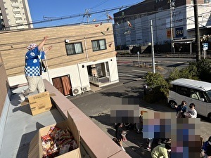 そして祭りの締めとして午後から菓子まきを行いました。近所の子供たちも参加して下さり、