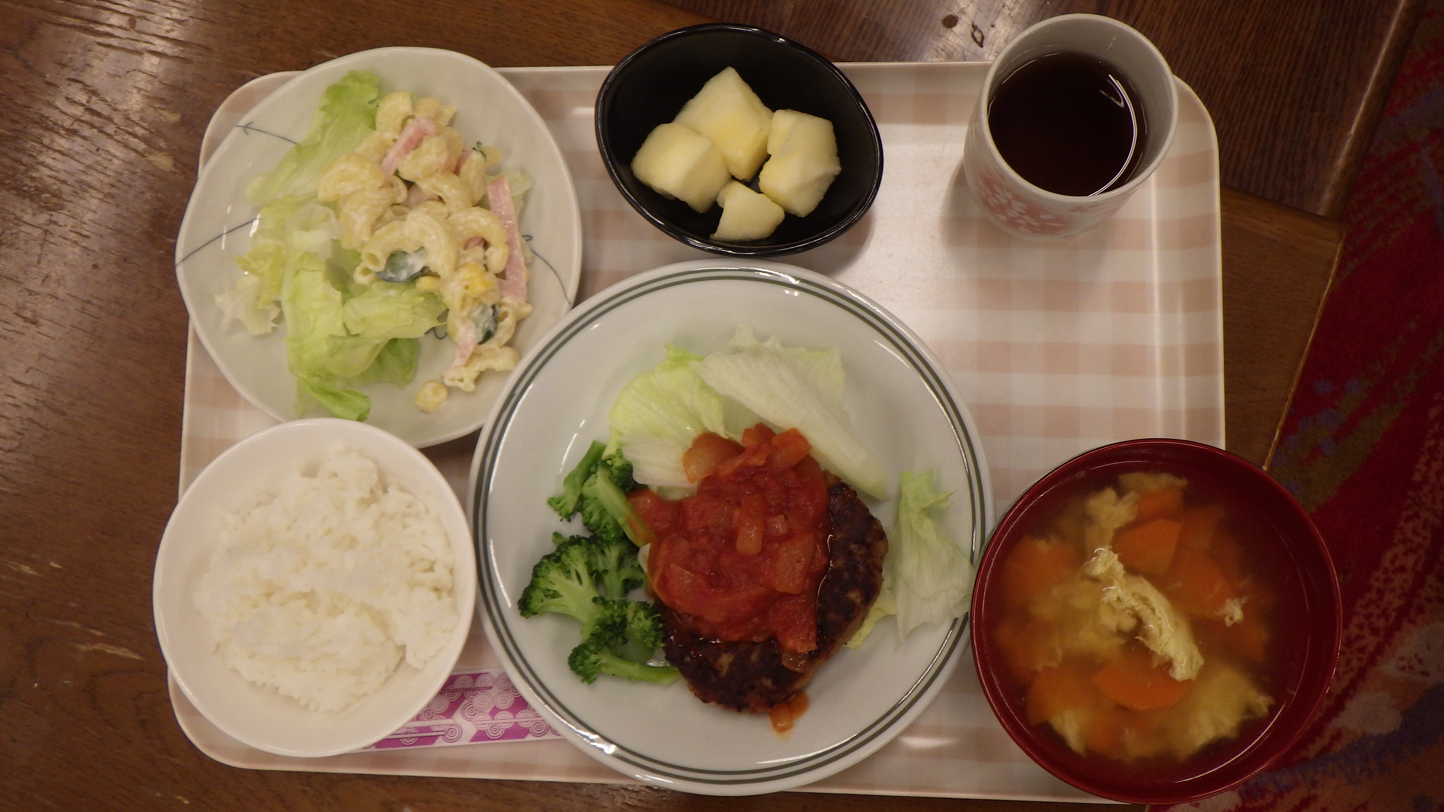 献立は「煮込みハンバーグ・マカロニサラダ・コンソメスープ・りんご」