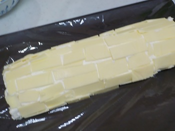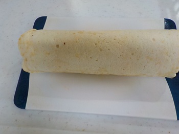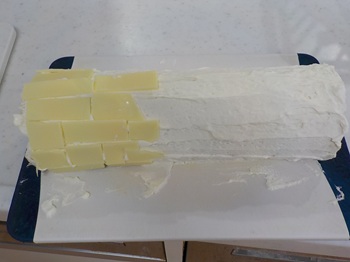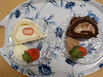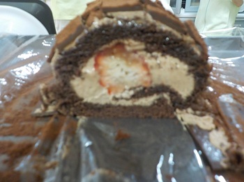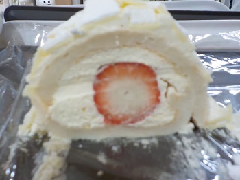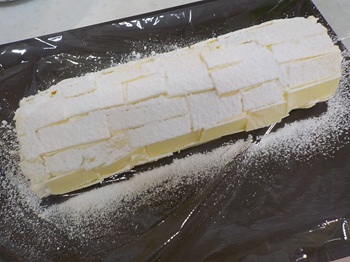 白いロールケーキにクリーム塗ってホワイトチョコレートを貼り合わせて