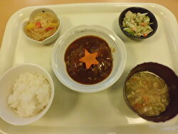 定番の煮込みハンバーグと野菜たっぷりのおかずと盛りだくさん。