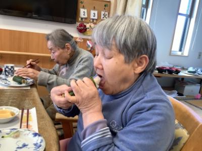 もぐもぐ・・・恵方を向いて、願い事をして、静かにお召し上がりです。