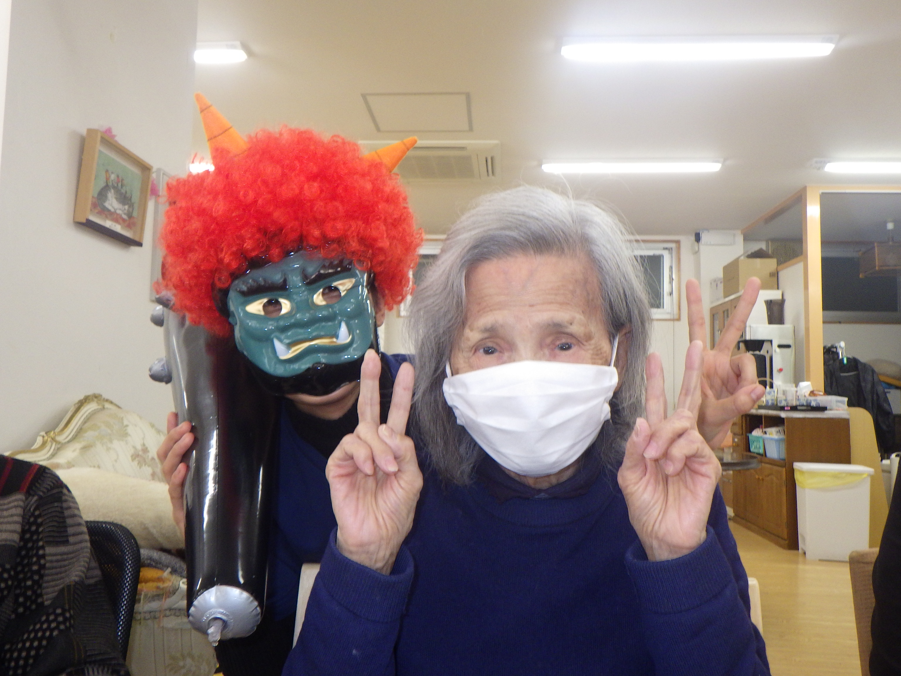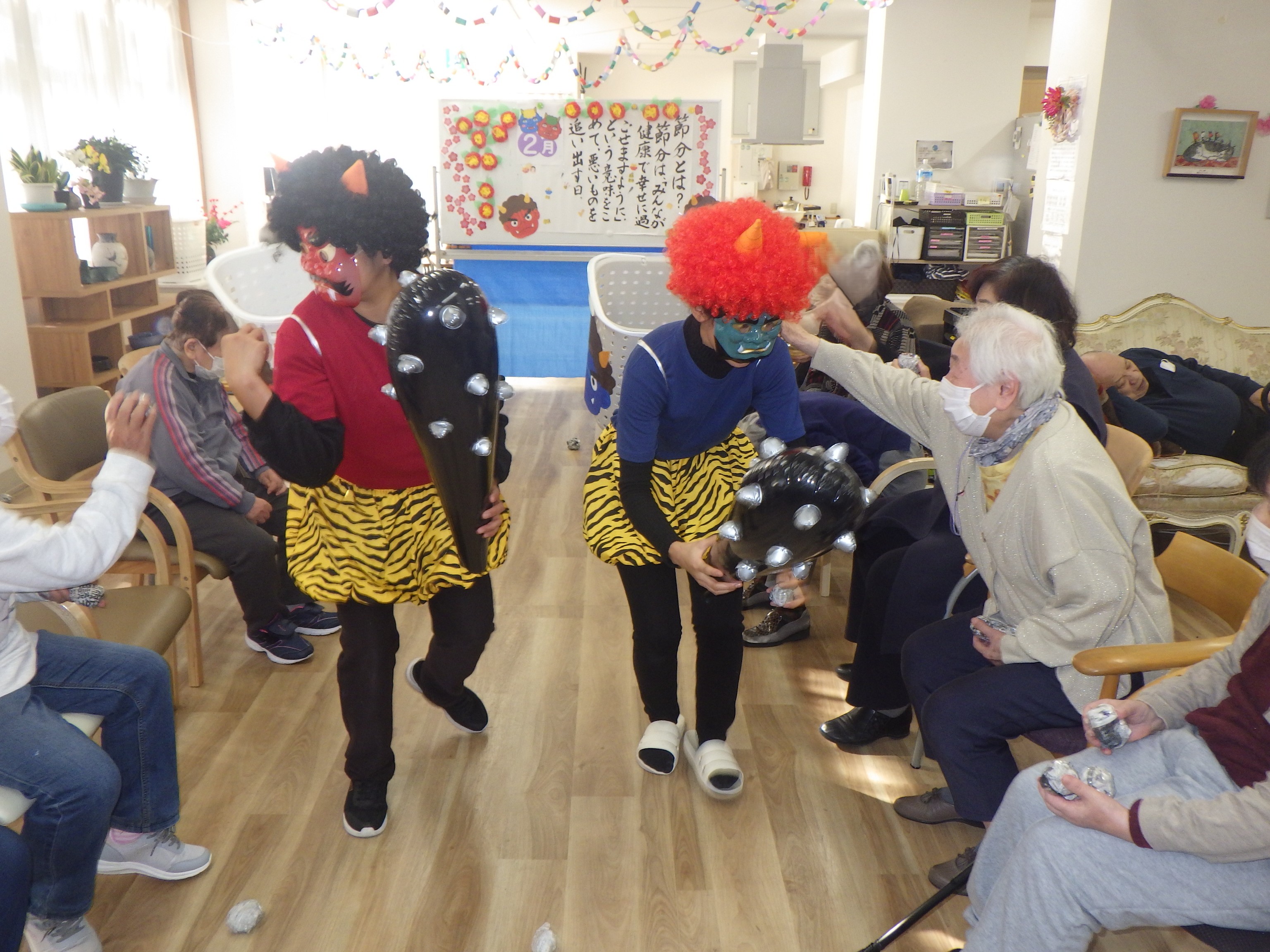 まずは鬼が2匹登場し利用者様と触れ合いました!!