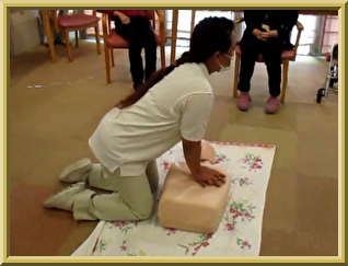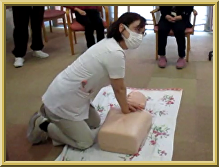 まずは 応急処置普及員が 胸骨圧迫の 説明をします。