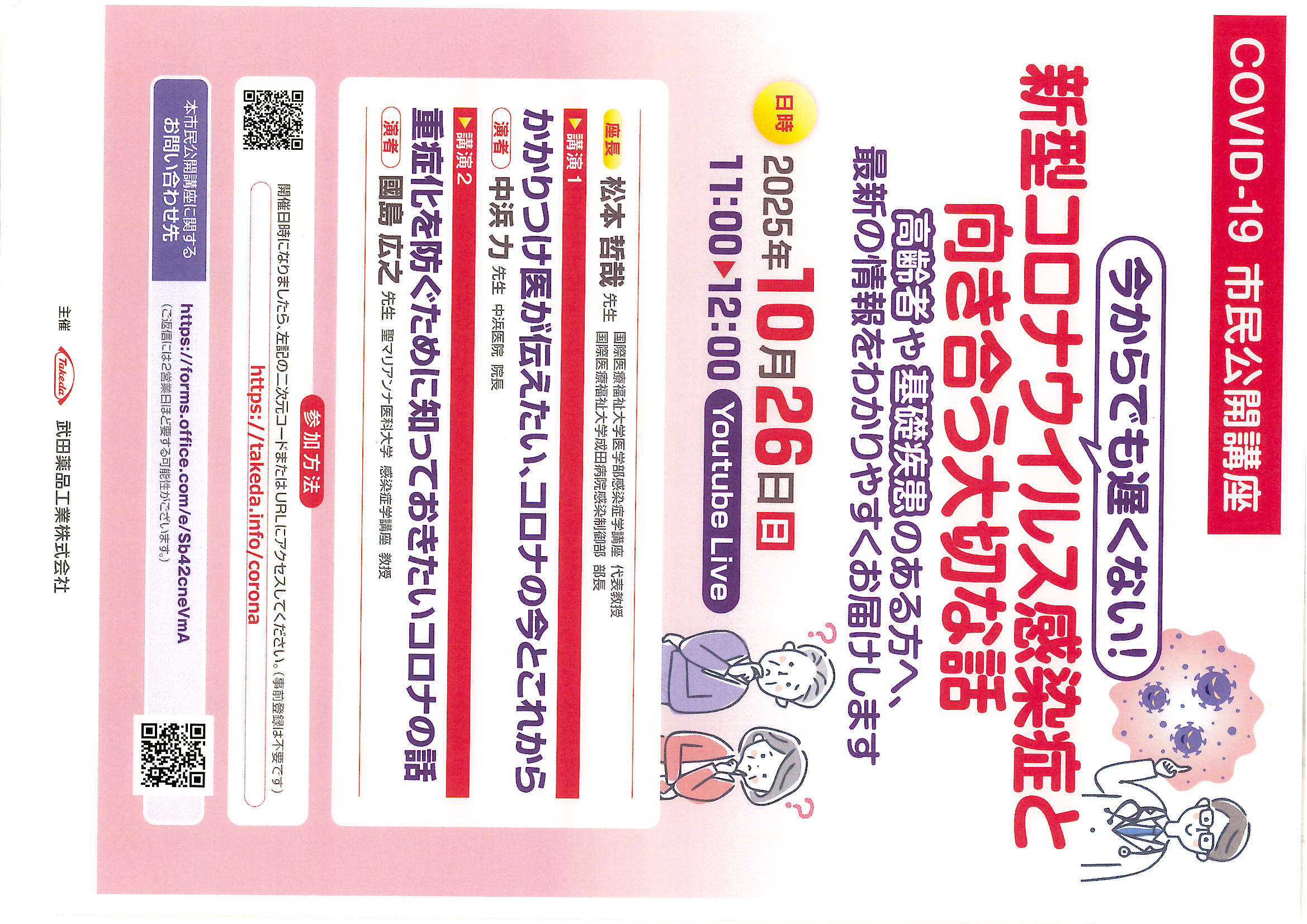 〇新型コロナウイルス感染症公開講座開催のお知らせ 新型コロナウイルス感染症についてのオンライン講座が開催されます! 高齢の方や基礎疾患をお持ちの方へ、最新の情報を専門医が分かりやすく解説してくださいます✨ 事前登録は不要で、どなたでもご視聴いただけます。 ぜひ、お気軽にご視聴ください(*^^*) ご視聴URL↓↓ https://takeda.info/corona